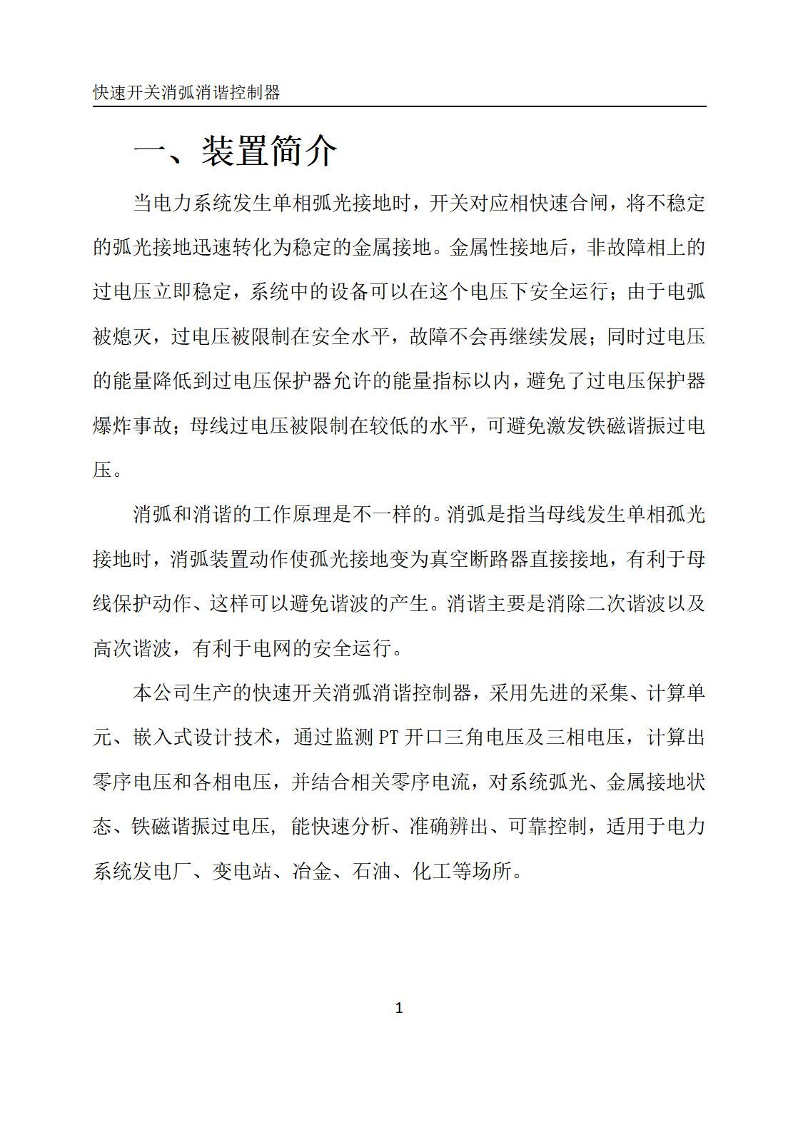 本公司生产的快速开关消弧消谐控制器,采用先进的采集、计算单元、嵌入式设计技术,通过监测PT开口三角电压及三相电压,计算出零序电压和各相电压,并结合相关零序电流,对系统弧光、金属接地状态、铁磁谐振过电压, 能快速分析、准确辨出、可靠控制,适用于电力系统发电厂、变电站、冶金、石油、化工等场所。