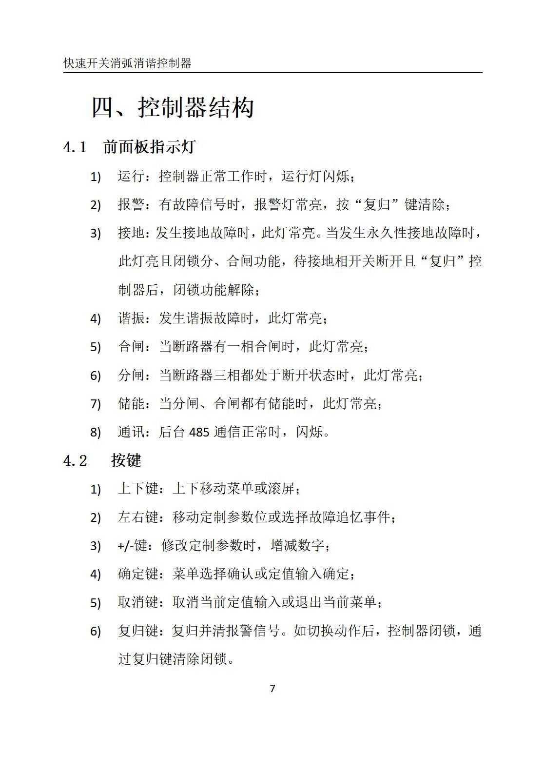 6) 复归键:复归并清报警信号。如切换动作后,控制器闭锁,通过复归键清除闭锁。